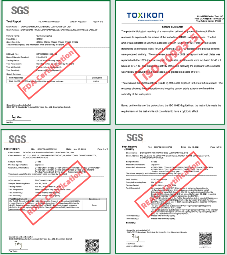 Hexuxinwang’s ODAKE brand adhesives deliver high performance, safety, and reliability for industries including medical devices, electronics, automotive, and industrial manufacturing. All products meet ROHS, REACH, FDA, and ISO certifications, ensuring global quality standards.